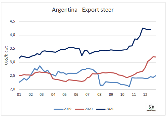 如果阿根廷政府宣布的牛肉出口政策得到確認并全年實行,明年不含骨類的出口量將達79萬噸,預計較2021年增長11.3%,2021年全年出口量將達71萬噸。