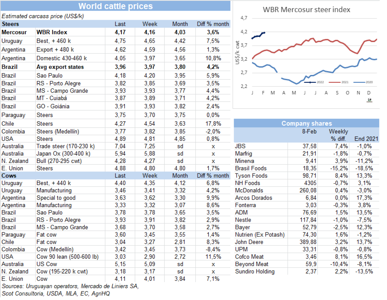 本周南方共同市場閹牛價格指數(shù)上漲了1美分至4.17美元/公斤。不同國家參考價均保持穩(wěn)定,盡管巴西方面育肥牛價格有輕微下調,下跌了1美分至3.96美元/公斤。其他三個國家牛家均為上漲趨勢,烏拉圭牛價目前是南美最高,本周上漲了10美分,達4.75美元/公斤的新紀錄。阿根廷出口閹牛價格上漲3美分至4.62美元/公斤,含出口稅。巴拉圭方面供應減少,待宰公牛價格上漲了5美分至3.75美元/公斤。