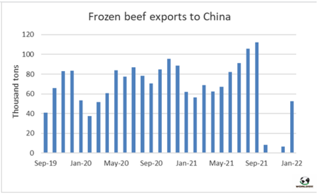 盡管低于去年出口量,但12月15日巴西牛肉重新開放后,1月中國再次成為巴西牛肉的主要出口目的地。根據巴西對外貿易部的數(shù)據,巴西對中國銷售總量為52583噸,盡管比2021年1月低15%,但中國仍然是巴西牛肉的主要買家。中國的復蘇并沒有阻止其他目的地的采購量增加,比如埃及和美國。埃及采購量同比增加了5倍,美國采購量同比增加了11倍,分別成為當月冷凍牛肉的第二和第三大出口目的地。