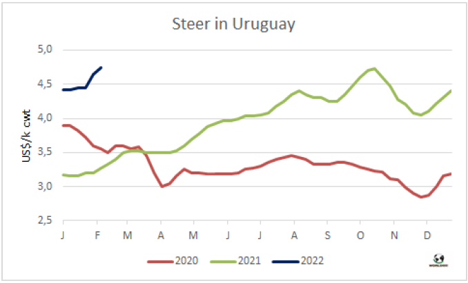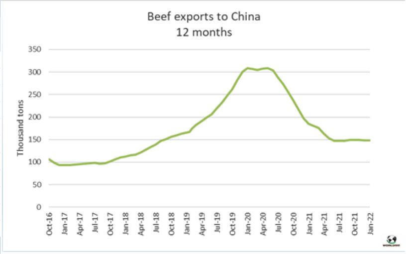 1月烏拉圭對中國的平均出口價格5931美元/噸,比12月的平均價格低43美元。烏拉圭對中國平均出口額連續(xù)11個月的增長畫上句號。2022年1月的平均價格同比增長了49%,這是由于不同部位肉價格的上漲,去骨部位肉相對于帶骨牛肉的占比更大。今年1月,烏拉圭對中國牛肉出口量占總出口量的76%,其中冷凍牛肉對中國出口量占總冷凍牛肉出口量的82%。根據海關出口數(shù)據,1月烏拉圭牛肉出口量33167噸,平均價格為6455美元/噸。盡管出口量較去年12月的峰值下降了20%,但仍比2021年1月高27%。
