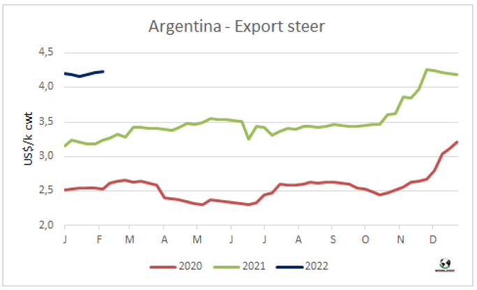育肥牛需求仍然很強勁,而1月下班月的降雨過后供應縮減,導致市場非常堅挺,價格強勁上漲,達到10月中旬水平。當時特種草飼閹牛的參考價是4.73美元/公斤。目前的特種草飼閹牛價格在4.75-4.8美元/公斤,價格以4.75美元/公斤為基準上下波動。但由于成交稀少,價格差異很大,很難確定參考價格?!艾F(xiàn)在沒人知道一頭牛值多少錢,”一名收貨人說?,F(xiàn)在的采購偏向于閹牛,如果是體重足夠的母?;蛐∧概?,需求也很強勁。主要用于國內市場的體重較輕的小母牛需求比較差,價格與母牛差不多,重型母牛的報價在4.4美元/公斤。預定時間不超過一周。預計市場將保持堅挺上行。