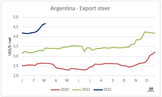 本周南方共同市場閹牛價(jià)格指數(shù)繼續(xù)8美分至4.36美元/公斤,創(chuàng)新紀(jì)錄。巴西烏拉圭阿根廷牛價(jià)均上漲,巴西育肥牛平均價(jià)格上漲主要原因是匯率走強(qiáng)和本地雷亞爾價(jià)格同步上漲,美金牛價(jià)較上周上漲了10美分至4.1美元/公斤。阿根廷和烏拉圭牛價(jià)達(dá)南美地區(qū)最高,也是歷史最高價(jià)格,本周出口閹牛參考價(jià)接近5.1美元/公斤,巴拉圭方面牛價(jià)趨勢相反,西方對(duì)俄羅斯的制裁限制了向這個(gè)國家銷售的可能性,巴拉圭受到了強(qiáng)烈的沖擊。