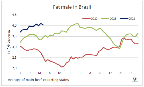 馬托格羅索州是巴西存欄最大的州,2月牛屠宰量和1月相比下降了8.2萬(wàn)頭(-19%),同比也下降了 3000頭,屠宰量連續(xù)三個(gè)月的增長(zhǎng)結(jié)束。Agrifatto稱,屠宰量下降的主要原因是公牛屠宰量較1月份下降了26.6%,只有18.36萬(wàn)頭,是35個(gè)月來(lái)最低。該咨詢公司推測(cè),屠宰量下降可能由于去年9月對(duì)中國(guó)出口暫停以及2021年最后一個(gè)季度待宰牛價(jià)格下降導(dǎo)致育肥進(jìn)程減緩。母牛屠宰量較上月減少8.6%,為16.47萬(wàn)頭,母牛屠宰量在中占比增加到47.3%,為24個(gè)月來(lái)的最高水平。然而這些數(shù)據(jù)本身并不意味著今年待宰牛供應(yīng)增長(zhǎng)趨勢(shì)的逆轉(zhuǎn)。