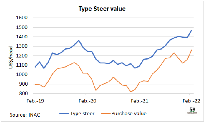 INAC把一頭體重480公斤,出成率54%的牛的銷(xiāo)售價(jià)值成為閹牛類(lèi)型價(jià)值,2月該指數(shù)達(dá)到了歷史新高1470美元,較上月增加81美元。INAC表示,環(huán)比的增長(zhǎng)是由于“出口部位肉和到國(guó)內(nèi)市場(chǎng)的東西銷(xiāo)售價(jià)值增長(zhǎng),部分抵消了內(nèi)臟和副產(chǎn)品價(jià)值的下降,而鮮皮的價(jià)格保持穩(wěn)定。”本月活牛采購(gòu)價(jià)格上漲了105美元,達(dá)1264美元,因此工業(yè)增加值(兩者之間的差額)收縮至206美元/頭,僅為閹牛類(lèi)型價(jià)值的14%。