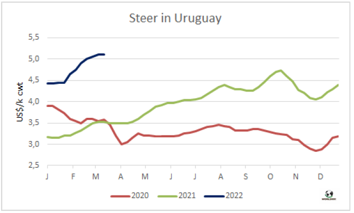 上周屠宰量受到24小時(shí)罷工影響。烏拉圭肉協(xié)統(tǒng)計(jì)截止3月12日當(dāng)周牛屠宰量51784頭,盡管屠宰量仍高于五萬(wàn)頭,但較上周有10%的降幅,是今年以來(lái)首次屠宰量同比下降。閹牛屠宰量下降最為顯著,較上周下降了3715頭至25258頭。小母牛屠宰量下降了1645頭至5908頭,母牛屠宰量?jī)H較上周下降了692頭至19327頭。屠宰活動(dòng)最活躍的工廠是Las Piedras(379廠),屠宰量4894頭,Minerva Pulsa(7廠) 屠宰量3925頭, 其次是Minerva Canelones(8廠)屠宰量3892頭。Marfrig四家屠宰廠屠宰量12424頭,較上周下降了2920頭,美麗華三家屠宰場(chǎng)屠宰量11237頭,較上周減少了288頭。3月前12個(gè)工作日牛屠宰量共計(jì)99980頭,較2021年同期減少了0.4%,主要是閹牛屠宰量減少了5.3%,小母牛屠宰量減少了11.2%,母牛屠宰量增加了10.2%,閹牛中只有2-4顆齒閹牛屠宰量增長(zhǎng)了7.1%。