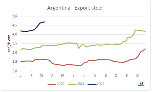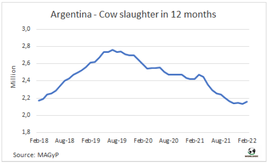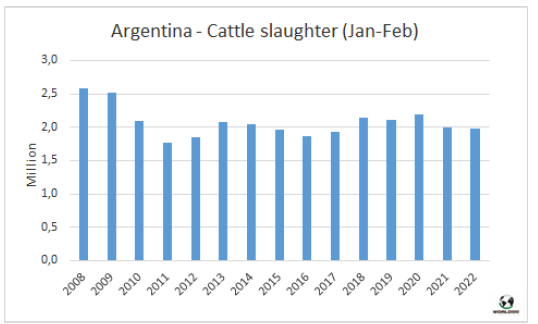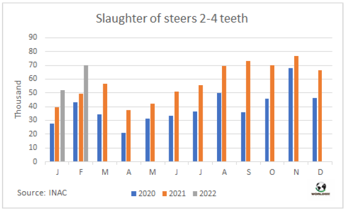 據(jù)農(nóng)業(yè)部估算,今年2月阿根廷牛肉產(chǎn)量23.2萬(wàn)噸,2022年前兩個(gè)月產(chǎn)量合計(jì)45.4萬(wàn)噸。單月看有所差異,但1-2月合計(jì)牛肉生產(chǎn)量與去年同期持平。2月人均消費(fèi)量51公斤,1-月人均消費(fèi)量48公斤,比2021年同期增長(zhǎng)8%。