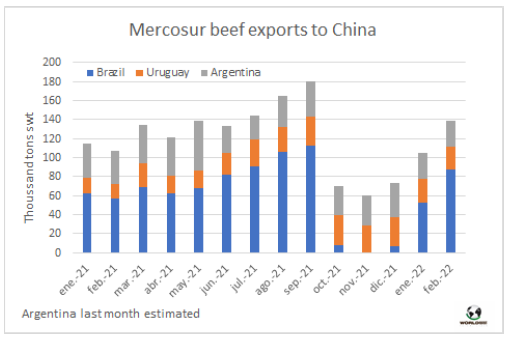 今年2月,南方共同市場(chǎng)國(guó)家向中國(guó)出口了近14萬(wàn)噸的牛肉,環(huán)比增加3.4萬(wàn)噸,同比也有所增加,這是自去年9月以來(lái)從未出現(xiàn)過(guò)的情況。這一增長(zhǎng)是由于來(lái)自巴西的銷(xiāo)售強(qiáng)勁擴(kuò)張,在12月15日重新開(kāi)放后,巴西已經(jīng)恢復(fù)了發(fā)貨速度。巴西2月的出口量為8.7萬(wàn)噸(比1月份多3.4萬(wàn)噸),而烏拉圭的出口量仍在2.5萬(wàn)噸左右。據(jù)估計(jì),阿根廷的出口量在2.7萬(wàn)噸上下擺動(dòng),與1月的出口量相當(dāng)。2月從南方共同市場(chǎng)運(yùn)出的這些貨物將在3月中旬至4月下半月抵達(dá)目的地。南方共同市場(chǎng)占中國(guó)進(jìn)口牛肉供應(yīng)的75%。今年2月從澳洲進(jìn)口量27,265噸 (新西蘭15,734噸,澳大利亞11,531噸)。另一個(gè)重要的供應(yīng)國(guó)是美國(guó),1月美國(guó)出貨量為16156噸,目前還沒(méi)有2月的數(shù)據(jù)。