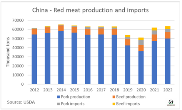 今年中國(guó)紅肉的生產(chǎn)和進(jìn)口將達(dá)到非洲豬瘟(ASF)疫情之前的水平,非洲豬瘟從2018年下半年開(kāi)始摧毀了中國(guó)的生豬存欄。根據(jù)美國(guó)農(nóng)業(yè)部駐北京辦公室發(fā)布的預(yù)測(cè),今年豬肉和牛肉的生產(chǎn)和進(jìn)口總額將達(dá)到6355萬(wàn)噸,比2021年多170萬(wàn)噸,與豬瘟出現(xiàn)之前的2016-2017年水平相似。美國(guó)農(nóng)業(yè)部辦公室預(yù)計(jì),今年的豬肉產(chǎn)量將增加250萬(wàn)噸,達(dá)到5,000萬(wàn)噸。就中國(guó)而言,豬肉進(jìn)口每年將大幅下降24%至330萬(wàn)噸;無(wú)論如何,這一產(chǎn)量是2017年和2018年的兩倍多,當(dāng)時(shí)的產(chǎn)量為150萬(wàn)噸。豬肉進(jìn)口量下降是由于豬肉產(chǎn)品的國(guó)內(nèi)價(jià)格下降,考慮到今年中國(guó)經(jīng)濟(jì)適度增長(zhǎng),進(jìn)口關(guān)稅提高至12%。牛肉方面,國(guó)內(nèi)產(chǎn)量預(yù)計(jì)增長(zhǎng)2.4%,達(dá)到715萬(wàn)噸,進(jìn)口量將溫和增長(zhǎng)2.5%(遠(yuǎn)低于往年),相當(dāng)于7.6萬(wàn)噸胴體重,達(dá)310萬(wàn)噸。美國(guó)農(nóng)業(yè)部此前的預(yù)測(cè)是,今年中國(guó)牛肉進(jìn)口量為325萬(wàn)噸。