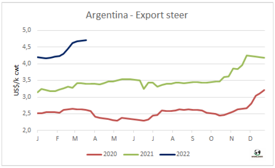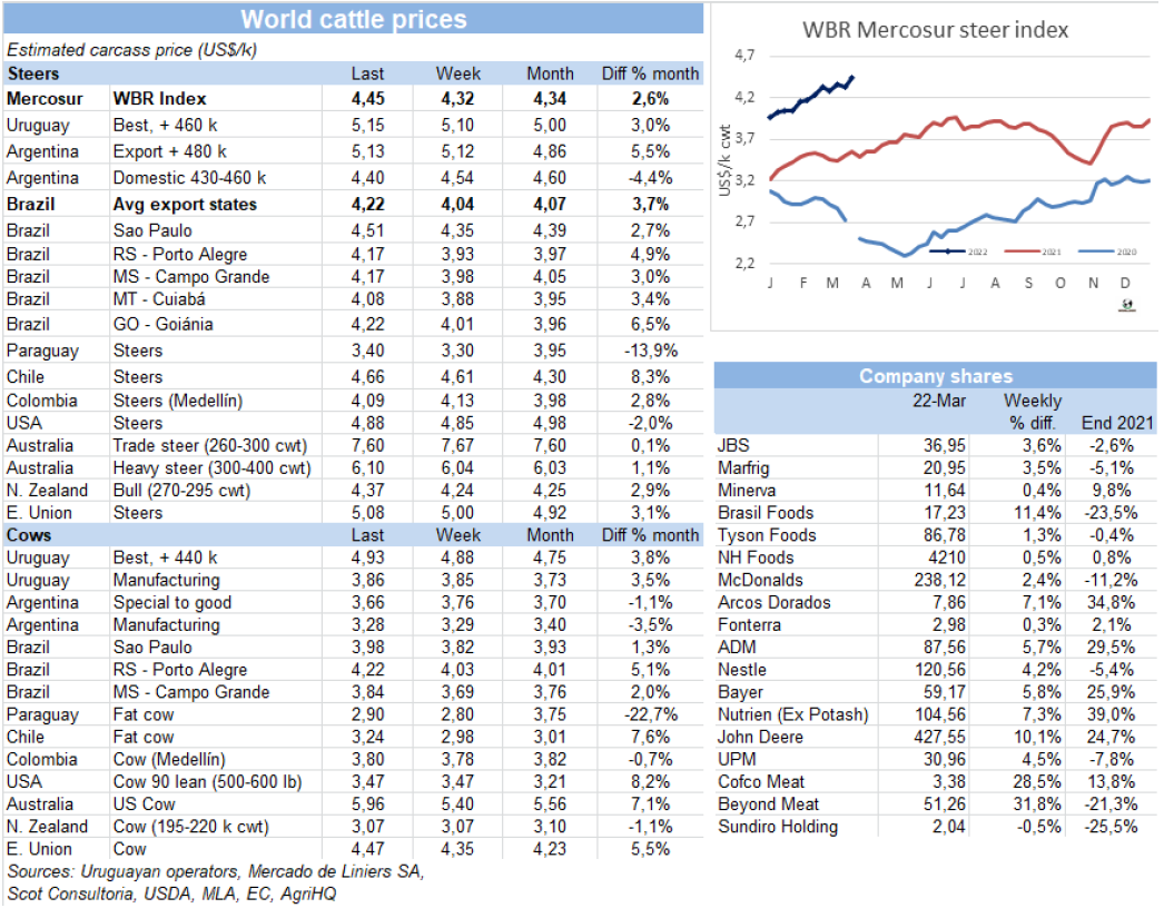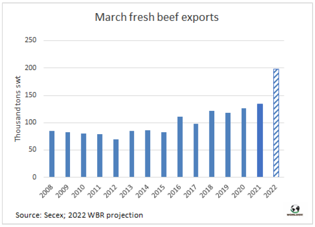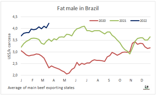 盡管上周牛肉出口速度有所下降,但3月有望成為歷史上巴西牛肉出口量最高的月份。如果在本月剩下的時(shí)間里保持這一勢(shì)頭,巴西的出口量將超過(guò)去年9月(18.7萬(wàn)噸)的最大值,接近20萬(wàn)噸。3月的前19天,巴西出口了121028噸牛肉,平均價(jià)格為5894美元/噸。這比2021年3月的出口量高出60%,而平均價(jià)格較上年增長(zhǎng)27.8%。