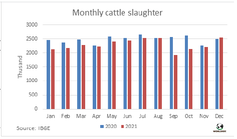 2021年牛屠宰量下降了7.8%