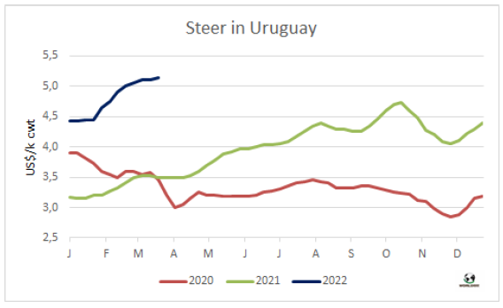 由于貨幣匯率走強(qiáng),南美地區(qū)美元牛價(jià)急劇上漲,主要是雷亞爾價(jià)格上漲。巴西貨幣本周升值近5%,帶動(dòng)新興國(guó)家一籃子貨幣的復(fù)蘇。利率上升,加上巴西出口牛肉價(jià)格的上漲,推高了巴西牛價(jià)。盡管育肥牛雷亞爾價(jià)格有所下降,主要出口州牛價(jià)上漲了18美分至4.22美元/公斤。南美其他三國(guó)的牛價(jià)也有小幅上漲,本周烏拉圭特種閹牛價(jià)格上漲了5美分至5.15美元/公斤,阿根廷英國(guó)串種閹牛上漲了1美分至5.13美元/公斤。巴拉圭待宰牛價(jià)格也有上漲,因?yàn)槿藗冾A(yù)期盡管西方制裁給對(duì)俄羅斯的出口業(yè)務(wù)增加了難度,巴拉圭還可以向俄羅斯出口一些牛。本周待宰牛價(jià)格上漲了10美分至3.40美元/公斤。