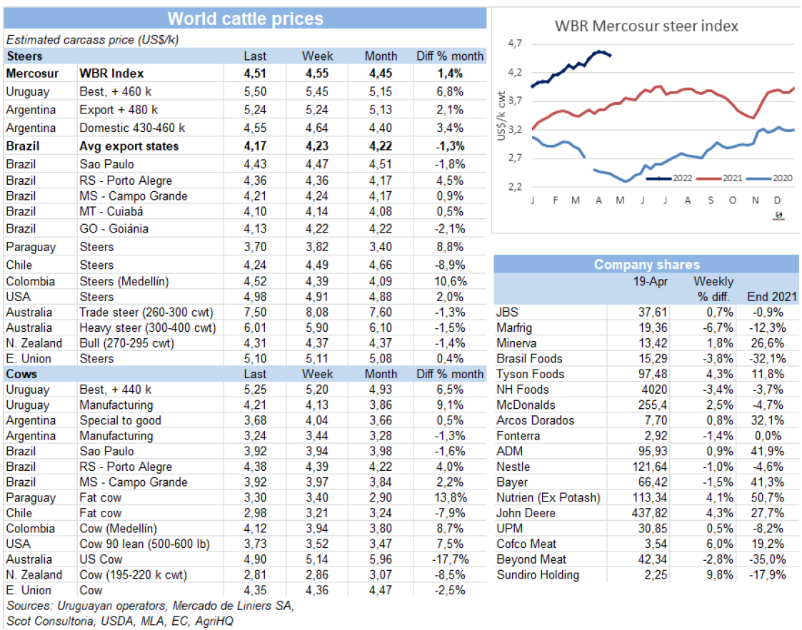 美麗華預(yù)計(jì)2022年下半年(尤其是2023年) 巴西的牛供應(yīng)量將增加,這將為加工廠帶來(lái)更大的利潤(rùn)率,而2023年的峰值周期利潤(rùn)率與之前相比可能更高。此外,巴西國(guó)內(nèi)消費(fèi)疲軟可能會(huì)限制牛價(jià)上漲(盡管美麗華預(yù)計(jì)2022年不會(huì)進(jìn)一步下跌)。根據(jù)桑坦德銀行巴西分行的報(bào)告,即使不像巴西那樣處于上升趨勢(shì),由于哥倫比亞、巴拉圭和烏拉圭一段時(shí)間內(nèi)持續(xù)的積極勢(shì)頭以及阿根廷到2022年的良好周期,美麗華海外市場(chǎng)的前景仍然穩(wěn)固。