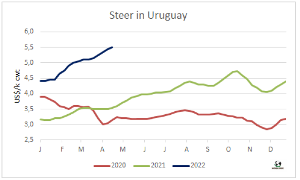 2022年第一季度,活牛出口僅5000頭,達(dá)2012年以來(lái)最低水平。但考慮到中國(guó)和土耳其這兩個(gè)主要的進(jìn)口國(guó)采購(gòu)興趣增長(zhǎng),行業(yè)普遍預(yù)計(jì)貿(mào)易流在接下來(lái)幾個(gè)月有所好轉(zhuǎn)?;钆YQ(mào)易少的主要原因不是缺乏需求,而是受育肥牛價(jià)格高的拉動(dòng),國(guó)內(nèi)市場(chǎng)出價(jià)較高。出口土耳其市場(chǎng)的知情人士稱正在采購(gòu)未來(lái)船期的訂單,采購(gòu)興趣主要集中在280公斤以下的乳齒閹牛,成交價(jià)2.8美元/公斤。土耳其方面,2020年宣布的從今年開(kāi)始停止進(jìn)口育肥用活牛的計(jì)劃被擱置。美國(guó)農(nóng)業(yè)部駐安卡拉辦事處預(yù)計(jì),由于飼養(yǎng)場(chǎng)牲畜短缺,今年進(jìn)口牲畜的數(shù)量將增加30%,達(dá)34萬(wàn)頭。對(duì)中國(guó)的出口需求也再次顯現(xiàn)。今年4月,海關(guān)報(bào)告了7000頭母牛的需求,5月同樣有7000頭肉母牛和乳母牛的需求即將發(fā)運(yùn)。市場(chǎng)參與者反映,每頭懷孕小母牛的出口收入高達(dá)800美元,每頭重達(dá)250公斤的小母牛的出口收入高達(dá)550美元。過(guò)去12個(gè)月里,烏拉圭出口了約20萬(wàn)頭活牛,較2021年底的26萬(wàn)頭相比大幅下降??紤]到采購(gòu)方興趣改善的預(yù)期,未來(lái)幾個(gè)月跌勢(shì)將有所減弱或趨于穩(wěn)定。