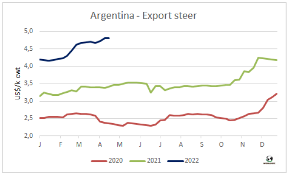 在供應(yīng)短缺和通貨膨脹的推動(dòng)下,出口閹牛價(jià)格經(jīng)歷了一次新的上調(diào)。上周牛價(jià)上漲了5-20比索/公斤,今年以來(lái)累計(jì)上漲了25%。質(zhì)量最好的英國(guó)純種閹牛價(jià)格在540-550比索之間,澤布雜交品種的價(jià)格上漲到510-530比索/公斤,今年迄今為止上漲了21%。特優(yōu)母牛價(jià)格上漲了5比索至465-485比索/公斤。主要賣(mài)到中國(guó)市場(chǎng)的工業(yè)母?,F(xiàn)在的價(jià)格約為400-435比索/公斤。