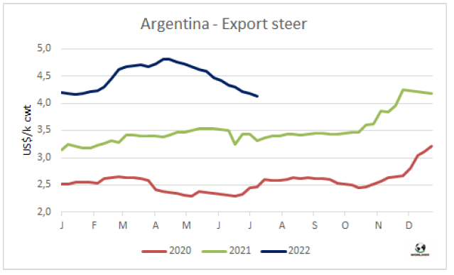 根據(jù)國(guó)家農(nóng)業(yè)商業(yè)控制局(DNCCA)的數(shù)據(jù),6月牛屠宰量113萬(wàn)頭,環(huán)比減少了2%。同比增長(zhǎng)了4%。這是因?yàn)槿ツ?span>6月農(nóng)業(yè)罷工近10天后重新開(kāi)放出口。根據(jù)ABC出口財(cái)團(tuán)的報(bào)告,6月的日均屠宰量是今年以來(lái)最高的。肉類產(chǎn)量達(dá)26.5萬(wàn)噸。今年第二季度的母牛屠宰量占比為47%,比第一季度增加了2個(gè)百分點(diǎn),這與解除工業(yè)母牛出口配額有關(guān)。