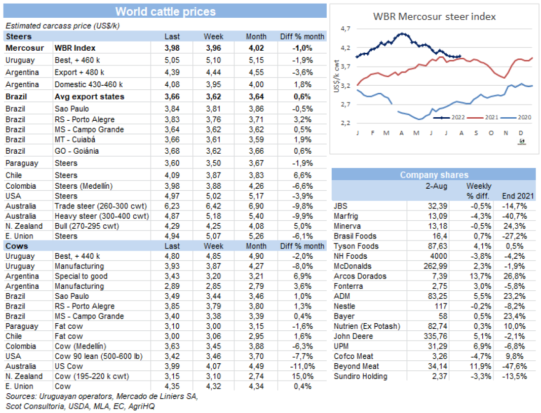 近兩周本周南方共同市場(chǎng)閹牛價(jià)格指數(shù)上漲了2美分,連續(xù)五周的下跌趨勢(shì)中止,本周該指數(shù)為3.98美元/公斤。主要原因是巴西匯率價(jià)格上漲,本周雷亞爾增值1.5%,巴西主要出口州美金計(jì)牛價(jià)上漲了4美分至3.66美元/公斤。巴拉圭待宰公牛價(jià)格上漲了10美分至3.6美元/公斤。阿根廷方面出口閹牛比索價(jià)格保持穩(wěn)定,隨著比索以每周1.2%的跌幅貶值,美金牛價(jià)下跌了5美分至4.39美元/公斤,含9%出口稅。烏拉圭方面需求仍然低迷,牛價(jià)下跌了5美分至5.05美元/公斤,市場(chǎng)價(jià)格差異仍然較大。