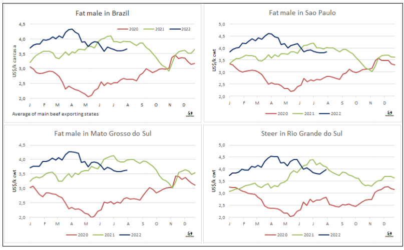 據(jù)巴西外貿(mào)部消息,七月牛肉出口均價(jià)是6549美元/噸,較六月的最高紀(jì)錄下降了4%。對(duì)中國(guó)出口價(jià)格的下跌趨勢(shì)開始在巴西牛肉出口均價(jià)中體現(xiàn)出來。七月巴西牛肉出口量167292噸,較2021年七月增長(zhǎng)了1000噸,較2022年七月出口量的歷史最高記錄僅相差2000噸。今年1-7月巴西雷累計(jì)出口牛肉110萬噸,平均出口價(jià)格6112美元/噸,出口量同比增長(zhǎng)了22%,價(jià)格同比增長(zhǎng)了25%。由于生產(chǎn)成本上漲,國(guó)內(nèi)需求下降,匯率有助于出口業(yè)務(wù),預(yù)計(jì)今年的巴西牛肉出口量將創(chuàng)新紀(jì)錄。