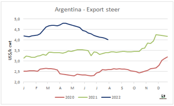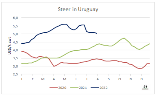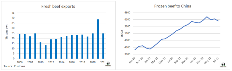 在牛肉出口量上可以感受到屠宰量的劇烈減少。據(jù)海關(guān)發(fā)布的數(shù)據(jù),七月烏拉圭牛肉出口量24863噸,達(dá)2020年八月至今兩年以來最低水平,平均出口離岸價(jià)7144美元/噸,環(huán)比下降了1.2%。中國(guó)仍是主要出口目的地,盡管對(duì)中國(guó)出口量較此前幾個(gè)月略有下降。平均每出口三噸牛肉其中兩噸出口到中國(guó)(65%),今年一月和三月對(duì)中國(guó)牛肉出口量占比曾達(dá)到72%。對(duì)中國(guó)出口的均價(jià)開始下跌。冷凍去骨牛肉平均出口價(jià)格為6504美元/噸,比6月份下跌了118美元,比4月的最高點(diǎn)下跌了275美元(4%)。冷凍帶骨牛肉平均價(jià)格較上月下降了264美元(5.5%)至4523美元/噸。今年前7個(gè)月,烏拉圭出口牛肉出口量累計(jì)23.8萬噸,平均出口價(jià)格7002美元/噸,出口量同比增長(zhǎng)了5.5%,平均價(jià)格同比增長(zhǎng)了29%。