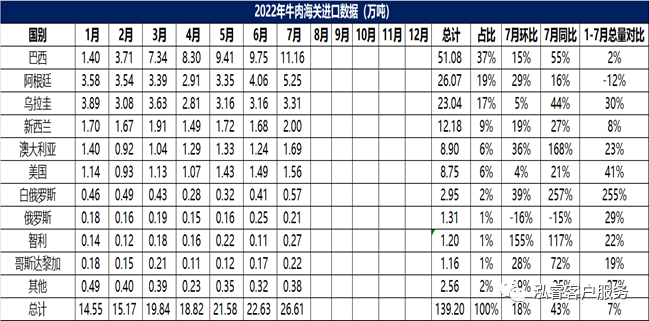 2022年7月中國主港牛肉進(jìn)口量26.61萬噸,環(huán)比增長18%,同比增長43%。1-7月牛肉進(jìn)口量累計(jì)139.2萬噸,同比增長7%。前五大進(jìn)口來源國分別為巴西、阿根廷、烏拉圭、新西蘭、澳大利亞,美國位居第六位。從第一大進(jìn)口來源國巴西的進(jìn)口量占總進(jìn)口量的37%。