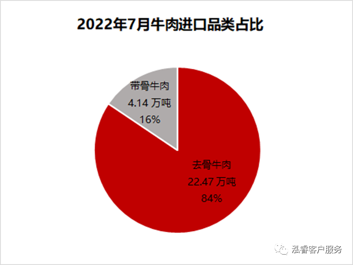 從牛肉進(jìn)口品項(xiàng)看,7月去骨牛肉進(jìn)口量22.47噸,占84%,帶骨牛肉進(jìn)口量4.14萬噸,占16%。