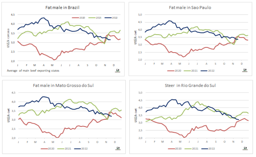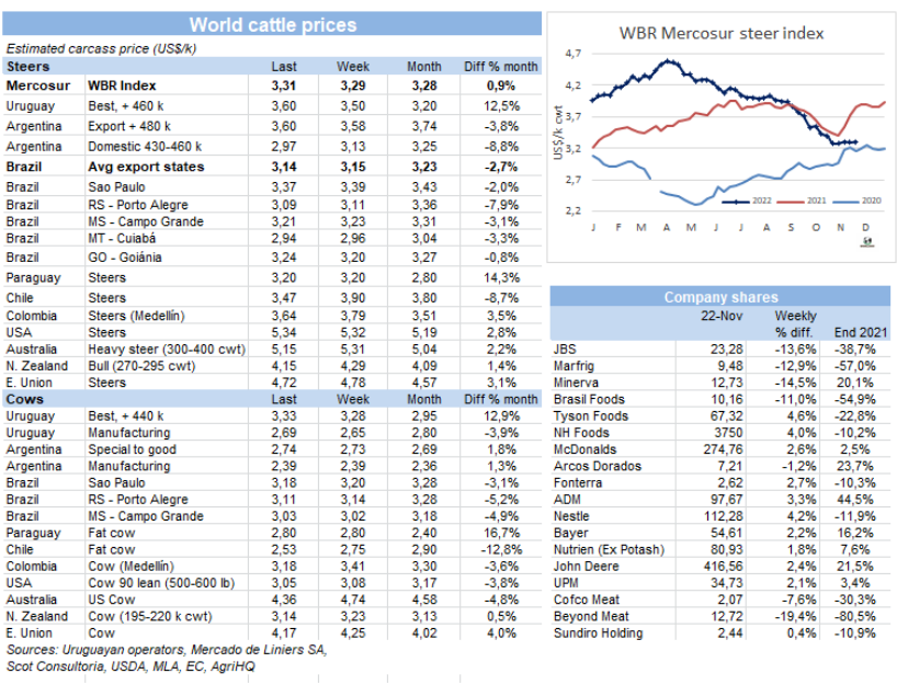 今年下半年,南美國(guó)家牛肉價(jià)格下跌,但谷物價(jià)格仍居高不下。這將導(dǎo)致南美國(guó)家減少育肥投入,從而導(dǎo)致2023年前幾個(gè)月育肥牛供應(yīng)下降。烏拉圭集約化養(yǎng)殖者協(xié)會(huì)(Aupcin)主席álvaro Ferrés告訴WBR,“有些人開始擔(dān)心2023年第一季度供應(yīng)減少。如果未來(lái)幾個(gè)月牛價(jià)上漲,育肥場(chǎng)的供應(yīng)狀況可能會(huì)改善,”從成本方面來(lái)看,由于動(dòng)物飼料價(jià)格仍維持在高位,且雨后預(yù)備牛價(jià)格穩(wěn)定,預(yù)計(jì)不會(huì)出現(xiàn)大幅下降。考慮到草飼牛的銷售旺盛,直到年中,以及由于缺水而導(dǎo)致的牧草狀況不佳,Ferrés認(rèn)為“必須進(jìn)行谷飼育肥才能得到成品牛?!蹦厦赖貐^(qū)其他國(guó)家情況也類似。巴西方面,根據(jù)Cepea的說(shuō)法,“目前的情況不適合圍欄牧場(chǎng)育肥?!卑⒏⒎矫妫帮暳蠄?chǎng)的現(xiàn)狀很差,”阿根廷育肥場(chǎng)協(xié)會(huì)(CAF)主席Fernando Storni告訴WBR。巴拉圭方面,近幾個(gè)月來(lái)育肥牛價(jià)格的暴跌導(dǎo)致飼養(yǎng)場(chǎng)每頭牛虧損100至200美元,因?yàn)榧茏优5牟少?gòu)價(jià)格非常高。作為全球牛肉的主要供應(yīng)商,南方共同市場(chǎng)在2023年的頭幾個(gè)月可能會(huì)出現(xiàn)供應(yīng)減少,特別是牛齡較小的育肥牛。這是一個(gè)很重要的信息,因?yàn)榘臀髦荒芟蛑袊?guó)出口屠宰時(shí)牛齡小于30個(gè)月的牛肉。