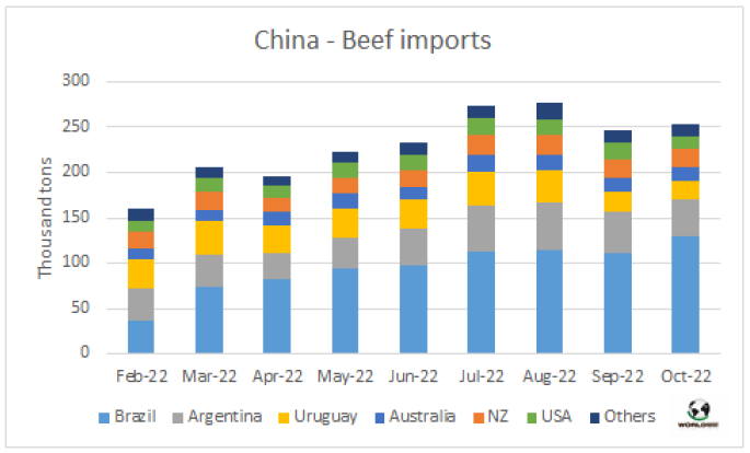 根據(jù)海關(guān)報(bào)告的數(shù)據(jù),中國(guó)10月進(jìn)口牛肉253,717噸,略高于9月5000噸,盡管低于7月和8月進(jìn)口量,7,8月進(jìn)口量超過27萬(wàn)噸。10月進(jìn)口量中幾乎都是冷凍牛肉,冰鮮牛肉只有3902噸。在249,816噸冷凍牛肉中,30,689噸是帶骨牛肉,平均進(jìn)口價(jià)格為3,291美元/噸,218,666噸是去骨牛肉,平均進(jìn)口價(jià)格為6,884美元/噸。帶骨牛肉的主要供應(yīng)國(guó)是烏拉圭,約9087噸,平均價(jià)格2982美元/噸。去骨冷凍牛肉的主要供應(yīng)國(guó)是巴西,約130168噸,平均價(jià)格6,681美元/噸。此外,牛副到港量2392噸,烏拉圭也是主要供應(yīng)國(guó),從烏拉圭進(jìn)口約781噸。盡管從澳洲出口量減少,考慮到9月和10月從南方共同市場(chǎng)發(fā)貨的數(shù)量,預(yù)期11月的牛肉進(jìn)口量仍然很大, 11月進(jìn)口量可能略低于10月。