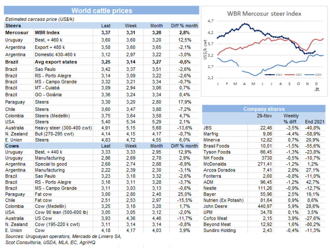 南方共同市場閹牛價格指數(shù)離開過去五周的窄幅波動區(qū)間,本周該指數(shù)上漲了6美分,至3.37美元/公斤,主要受巴西牛價上漲的拉動。巴西主要出口州育肥牛價格上漲11美分至3.25美元/公斤,主要因為雷亞爾價格上漲,以及匯率升值1.5%。巴拉圭方面,價格也有上漲,待宰閹牛價格上漲了10美分至3.3美元/公斤。阿根廷方面,出口閹牛比索價格上漲匯率下降導(dǎo)致美元價格下跌2美分至3.58美元/公斤。烏拉圭連續(xù)四周的上漲趨勢停止,本周牛價保持3.6美元/公斤。