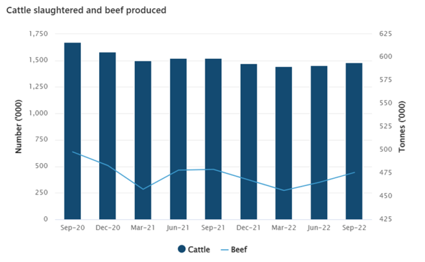 據(jù)報道,與2022年7月相比,澳大利亞在2022年9月當季牛屠宰量增加了1.9%至150萬頭,牛肉產(chǎn)量增長了2.3%至475628噸。在年度比較中,屠宰量同比下降了2.5%,產(chǎn)量同比下降了0.7%。母牛的屠宰率達44%,這表明今年最后一個季度牛群的重建仍在繼續(xù)。另一方面,全國羊屠宰量同比增長了2%,至592萬頭,羊肉產(chǎn)量同比增長7.2%,至14.51萬噸。