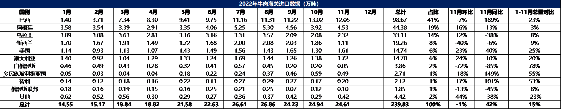 11月中國(guó)主港牛肉進(jìn)口量24.61萬(wàn)噸,環(huán)比下降1%,同比增長(zhǎng)42%。1至11月主港牛肉進(jìn)口總量239.83萬(wàn)噸,同比增長(zhǎng)15%。