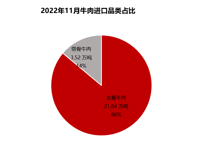 從進(jìn)口品項(xiàng)看,帶骨牛肉進(jìn)口量3.52萬(wàn)噸,占比14%,去骨牛肉進(jìn)口量21.84萬(wàn)噸,占比86%。