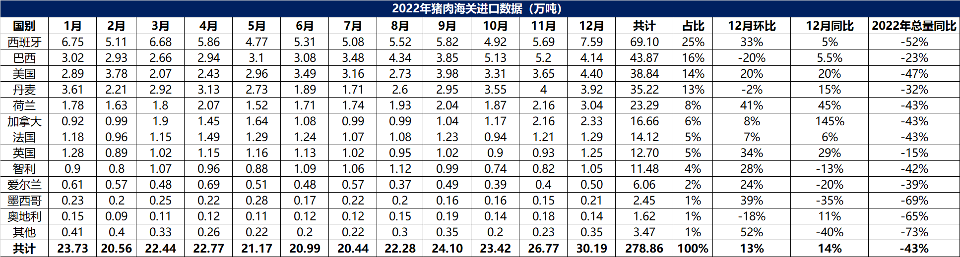 2022年12月中國主港豬肉進(jìn)口量30.19萬噸,環(huán)比+13%,同比+14%。全年中國主港豬肉進(jìn)口總量278.86萬噸,同比-43%。12月豬肉前四大進(jìn)口來源國依然是西班牙、巴西、美國、丹麥,分別占當(dāng)月進(jìn)口量的25%、16%、14%、13%。
