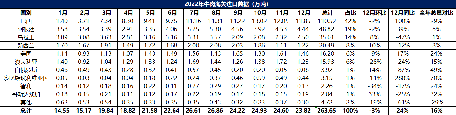 2022年1-12月中國主港牛肉進(jìn)口量263.65萬噸,同比+16%。12月主港牛肉進(jìn)口量23.82萬噸,同比+24%,環(huán)比-3%。2022年牛肉前十大進(jìn)口來源國依次是巴西、阿根廷、烏拉圭、新西蘭、美國、澳大利亞、白俄羅斯、玻利維亞、智利、哥斯達(dá)黎加。