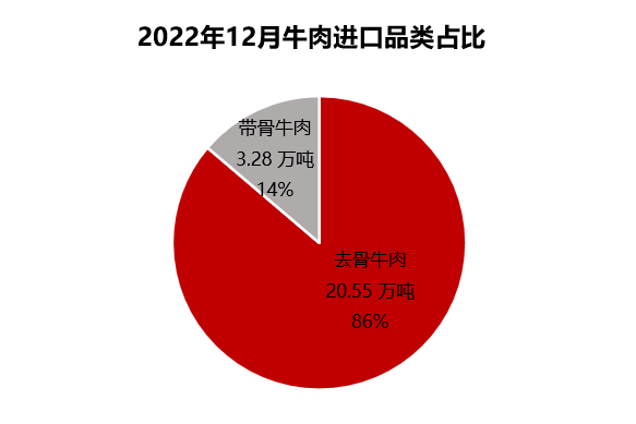 從進(jìn)口品類看,12月去骨牛肉進(jìn)口量20.55萬噸,占86%,帶骨牛肉進(jìn)口量3.28萬噸,占14%。