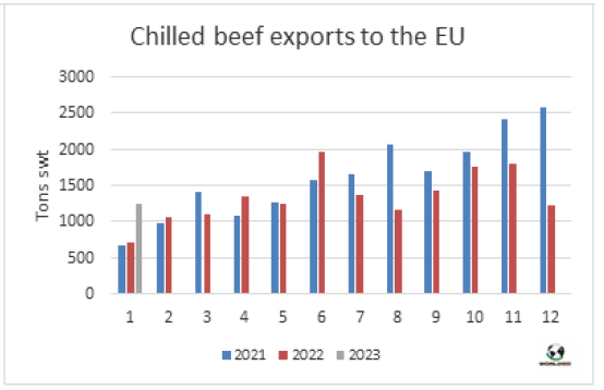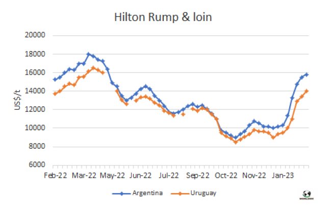 2023年開年至今希爾頓配額內(nèi)冰鮮牛肉價格保持爆發(fā)式增長節(jié)奏。上周阿根廷臀腰肉參考價15500-16200美元/噸,烏拉圭產(chǎn)品參考價14000美元/噸,一些進口商擔心新冠疫情給市場帶來不確定性,本周初還價低于10000美元/噸,烏拉圭Marfrig的CEO上周表示歐洲市場表現(xiàn)出更強的活力,需求比幾個月之前更好了。