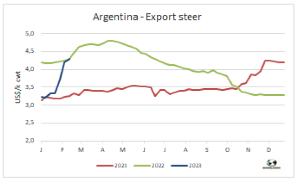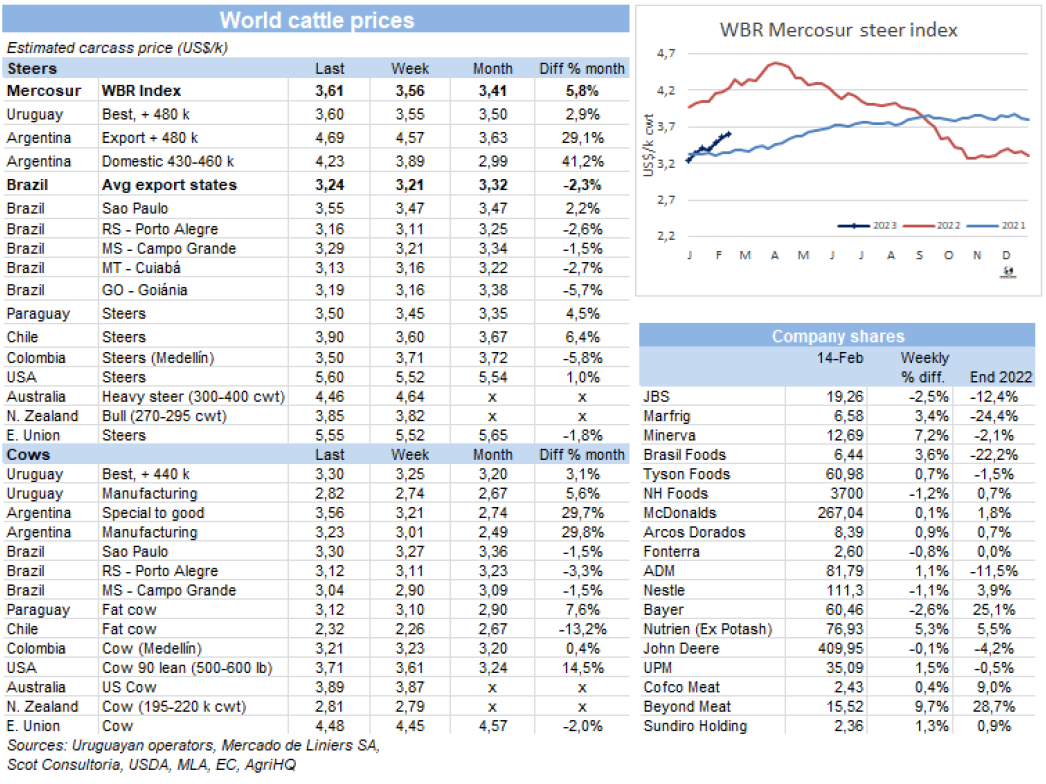由于活牛價格急劇上漲,政府為控制不讓價格轉移到消費端者身上,給屠企施壓。周一政府重新啟動了一項“關愛肉”計劃,通過該計劃,企業(yè)必須承諾以低于當?shù)厥袌?span>30%左右的價格分銷七項部位肉。昨天,也就是周二,新加一項要求是這些公司必須每月貢獻1.5萬噸的部位肉。由于牛肉是食品和飲料類別中權重最大的商品,占消費者價格指數(shù)(CPI)的24%,經(jīng)濟部希望能影響2月的通貨膨脹率。與此同時,政府還對海關和聯(lián)邦公共收入管理局施加壓力。政府發(fā)布的一份報告稱,他們發(fā)現(xiàn)“在2021年至2022年期間,523份牛肉出口許可證存在虛開發(fā)票的操作”。報告指出,此類操作涉及22家出口商,“少開發(fā)票”的總額為1190萬美元(占這兩年出口額的0.2%)。一些公司本周無法獲得出口許可。此外,已經(jīng)廢除的2021年6月開始實施的肉類出口配額也被恢復。這一配額最初為2.9萬噸,并加上關稅配額,后來變得更加靈活,達3.9萬噸,而現(xiàn)在又回到了原來的數(shù)量。就此而言,為了讓國內(nèi)市場獲得便宜的肉類,出口企業(yè)正在讓步,例如將針扒和肩胛排除在出口禁令之外,建立一個特殊的牛肉出口用匯率——比官方匯率高出1美元,以及只允許擁有屠宰場的公司授予出口許可證等其他要求。