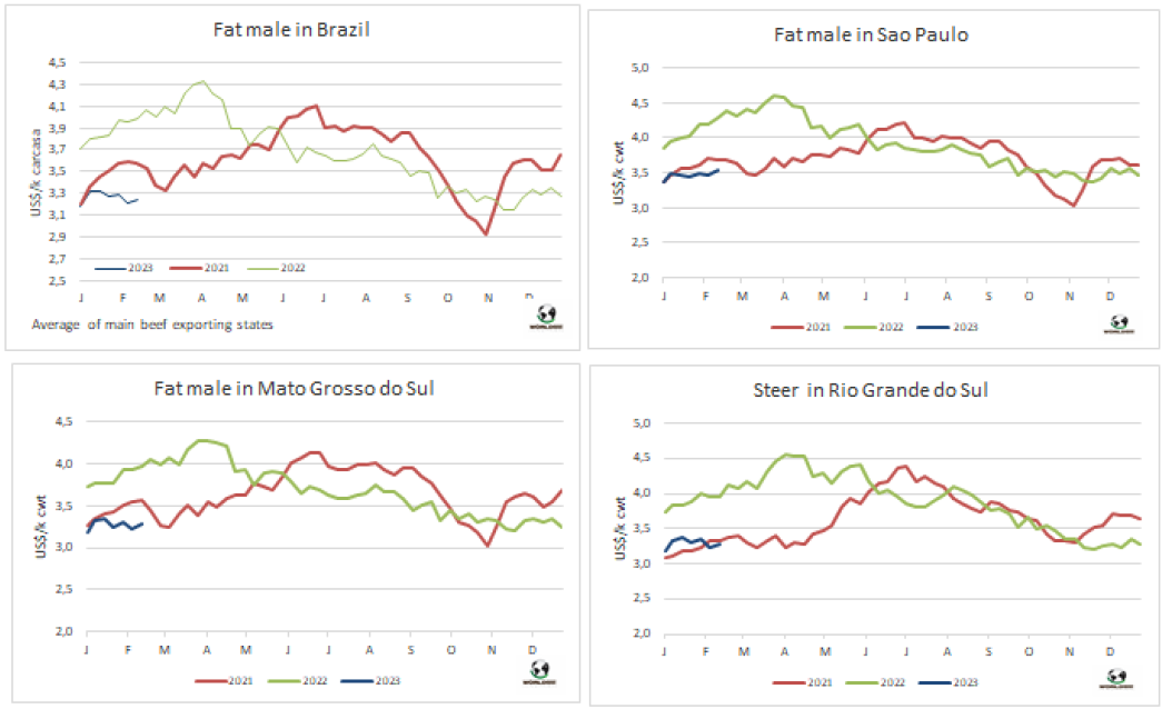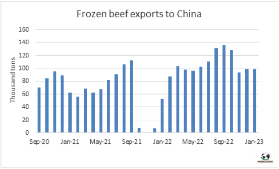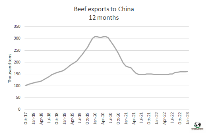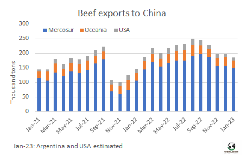 根據(jù)出口國的部分數(shù)據(jù)估計,中國牛肉市場的主要供應國1月份對中國出口量約為18.5萬噸。這是自1 2022年1月以來的最低,比去年8月(25.2萬噸)減少了約6.6萬噸。南方共同市場國家出口了約14.9萬噸(阿根廷的數(shù)據(jù)為預估數(shù)據(jù)),而澳洲國家則向中國出口了2.6萬噸。去年12月,美國向中國出口不到1.1萬噸,預計1月份這一出口量不會大幅增長。
