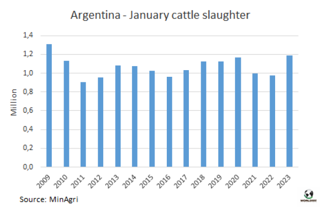 官方數(shù)據(jù)表明,阿根廷1月牛屠宰量1185257頭,同比增加了21.1萬頭,增幅22%。是2009年至今14年以來最高。屠宰量增長最大的種類是母牛,同比增長了46%至19.7萬頭,主要與阿根廷大部分地區(qū)干旱和來自中國的需求增加有關。屠宰量最大的工廠是Swift(13廠),屠宰量35146頭,其次是Gorina(2025廠),屠宰量27012頭,Arebeef(2082廠),屠宰量26577頭。