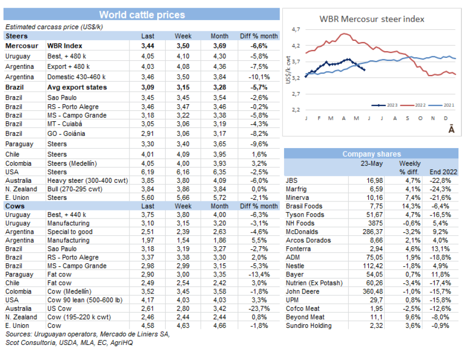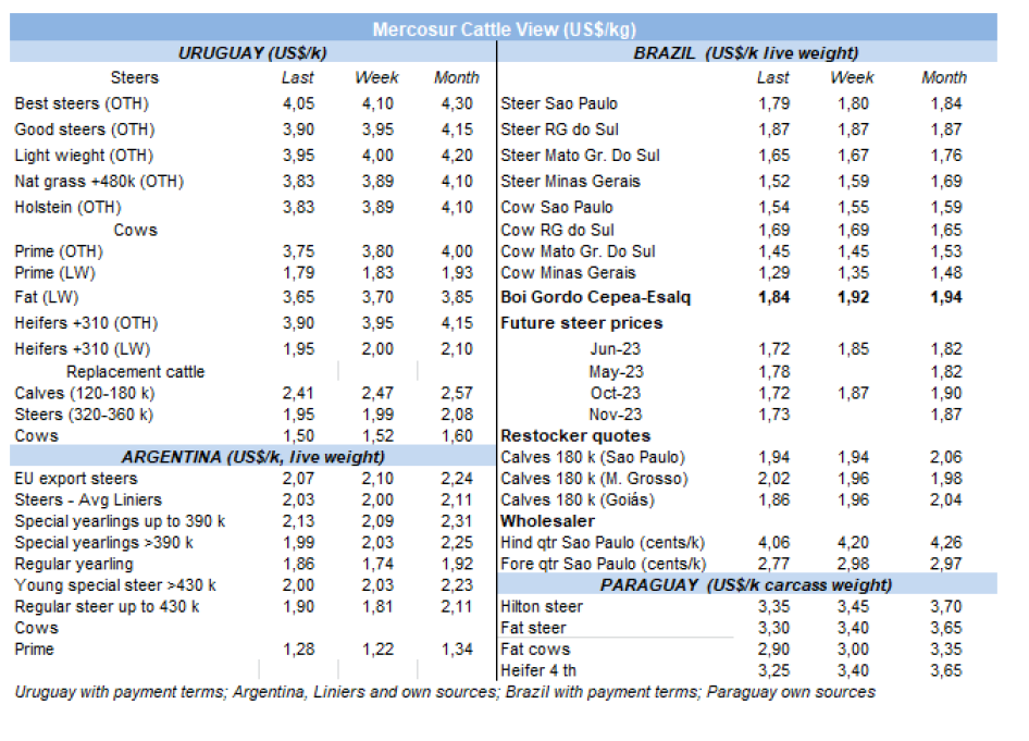 關(guān)于烏拉圭肉類綜合企業(yè)面臨的供應(yīng)條件,Secco說,在活動方面是最可預(yù)測的,因為 "我們知道沒有什么"。冬季屠宰量的下降可能仍然高于一年中的20%,這是經(jīng)歷過的干旱情況導(dǎo)致的結(jié)果,而且旱情仍無法解決。供應(yīng)量將很少,主要市場的需求沒有活力,巴西提供更便宜的牛肉價格,所以我們知道將經(jīng)歷一個市場寒冬,在低供應(yīng)和市場之間試圖重新調(diào)整。牛的價格與出口價格有很高的關(guān)聯(lián)性。他預(yù)計在未來幾個月里的出口價約為$4,200-$4,300/噸,這將導(dǎo)致牛的價格 "低于每公斤胴體$4"。
