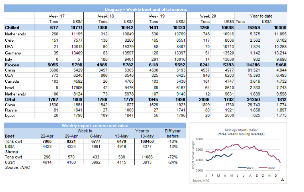 在2023年前四個月,牛肉出口總量為21萬噸(產(chǎn)品重量),價值接近8.95億美元,這一數(shù)字意味著數(shù)量上同比增長13.4%,同時貨值下降17.3%,中國占了發(fā)貨量的77.4%。去年(從2022年5月至2023年4月),肉類出口總量為65.8萬噸產(chǎn)品重量(相當(dāng)于938,500噸帶骨牛肉),價值接近32.73億美元。