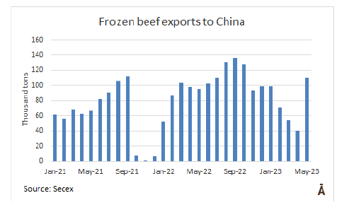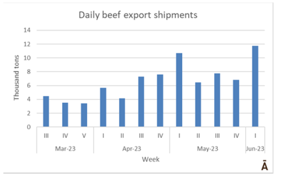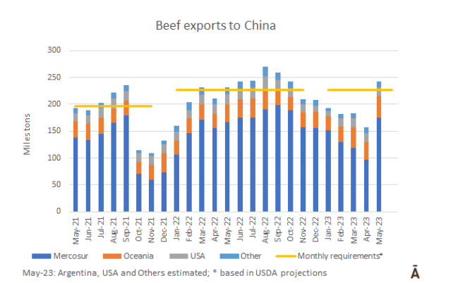 據(jù)估計,5月份約有24萬噸牛肉運往中國,這一數(shù)量將超過他們每月的需求量(估計為22.5-23萬噸)。自去年10月以來,出貨量一直低于需求量。