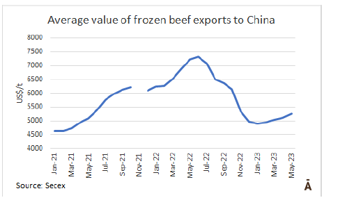 巴西對華牛肉出口量不再受非典型瘋牛病暫停的影響后,在5月份飛升,數(shù)據(jù)顯示,5月份有110,988噸牛肉運往中國,環(huán)比增長7萬噸,是自去年10月以來的最高月出口量。均價也有所增加為$5255/噸,環(huán)比增長2.8%。5月均價為$5255/噸,環(huán)比增長2.8%,連續(xù)四個月保持上升趨勢。