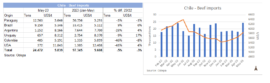 2023年前5個月智利進口了97345噸,均價$5608/噸;數(shù)量同比下降5%,中值收縮3%。