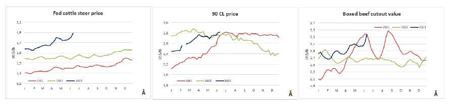 根據(jù)官方數(shù)據(jù)顯示5月份屠宰了128萬頭牛,比上個月增長了近9%,年度增長率略高于10%。按工作日計算,5月份的屠宰量超過去年4月份總量的3%,比2022年5月的屠宰量高出16%。雖然在這兩方面的比較中都有增長,特別是同比增長,但與上個月相比有所下降,當時日屠宰量在每月比較中增長11%,同比增長18%。在2023年的前五個月,牛的屠宰量超過了2022年同期。今年共有600萬頭牛被屠宰,比去年同期多12%。