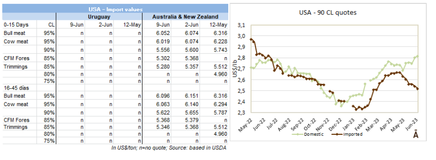 一位烏拉圭出口商說好消息是美國國內的價格很高。壞消息是澳大利亞整極力向美國運送超過其40萬噸的免稅配額的出口量。鑒于中國幾周來市場表現(xiàn)出的疲軟狀態(tài),美國的市場越來越有優(yōu)勢。美國出的CFR參考價格為牛霖$5300-$5400,砧扒$5900,大米龍$5700。美國的出價要比中國的出價更有吸引力。而問題在于烏拉圭每年只有2萬噸的免稅配額。美國出的CFR價95CL牛前(支付26.4%的關稅)$4300,90CL牛前$4000-$4100,85CL牛前$3950。這些出價也比中國高,盡管需求不是很大。消息人士說屠宰量低的情況下,美國的出價很有吸引力。