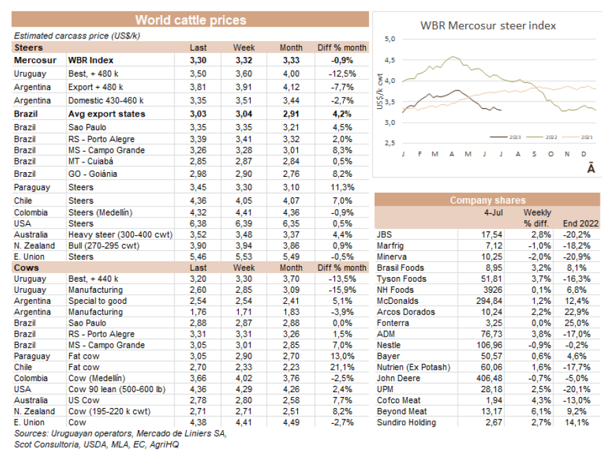 巴西,以雷亞爾計算的價格的小幅回升被匯率的下降所逆轉(zhuǎn)。主要出口國的肥牛下跌1美分,至每公斤3.03美元,仍然是該地區(qū)的最低參考價格。