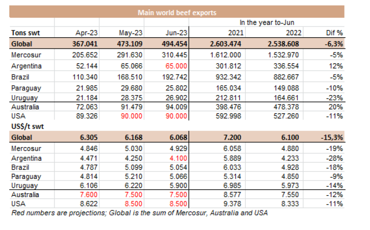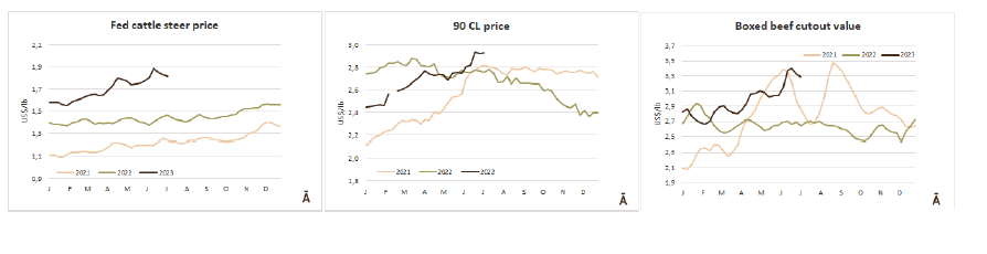 在2023年上半年,巴西出口了88.3萬噸牛肉,平均價值為每噸4928美元,年出口量下降了5.3%,平均價值下降了18.3%。豬肉和雞肉的出口每年分別增長15%和10%。