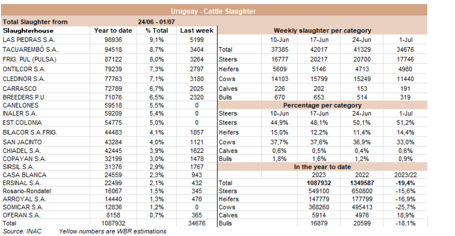 活動最多的工廠仍然是拉斯皮德拉斯,有5199頭牛,其次是馬弗里格-塔庫倫博(3404頭)和米涅瓦-普爾薩(3264頭)。MF只在兩個工廠工作,屠宰了6,584頭動物,而Minerva也在兩個工廠屠宰了5289頭,因為Canelones的工人從本周起開始集體休假,上周沒有進(jìn)行屠宰。