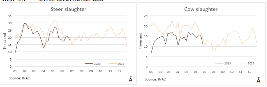 上周牛的屠宰量下降,是4月初復(fù)活節(jié)以來12周的最低值。INAC報告說,屠宰了34,676頭牛,比前一個星期少了6,653頭(-16%),比去年同期的近40,000頭少了13%。