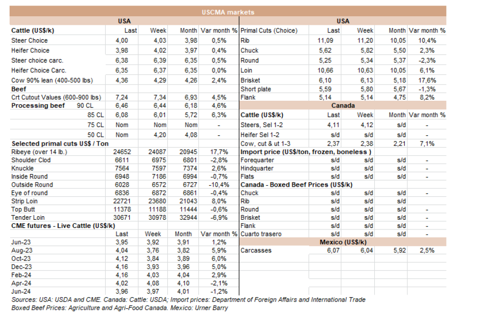 上周,在舊大陸夏季來臨之際,冰鮮牛肉市場走強(qiáng)。進(jìn)口市場消息稱,阿根廷產(chǎn)品的參考價格在12,800-13,200美元(FOB)之間,一些公認(rèn)的品牌達(dá)到13,400美元。烏拉圭參考價格則是在11,800-12,000美元的FOB價格。