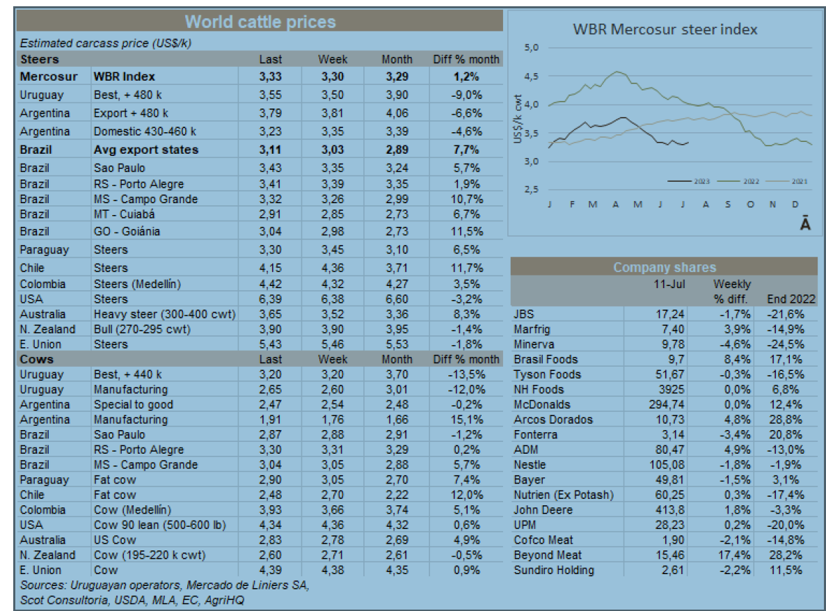 在國際市場穩(wěn)定的支持下,極低的供應(yīng)和比較大的購買興趣使市場更加穩(wěn)定。此外,Marfrig-Colonia 恢復(fù)了工作,因此只剩下Marfrig-Inaler and Minerva-Canelones兩家公司沒有交易。